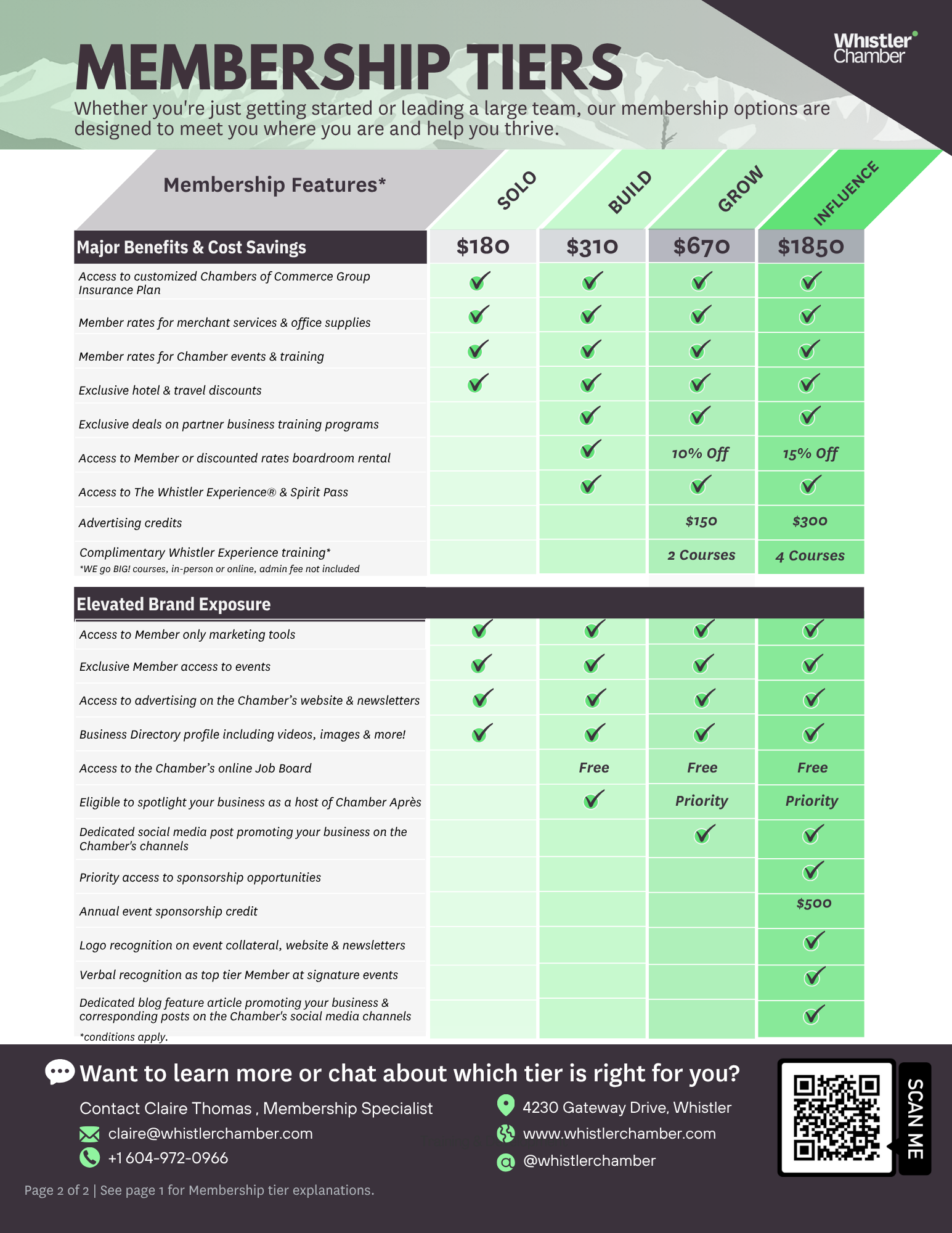 From access to the Chambers Group Insurance Plan and Whistler Experience & Spirit Pass programs, to business savings, discounted events & training, and opportunities for increased exposure, there are a lot of benefits that Members enjoy. Follow the link below to learn more about the benefits that appeal to you most.